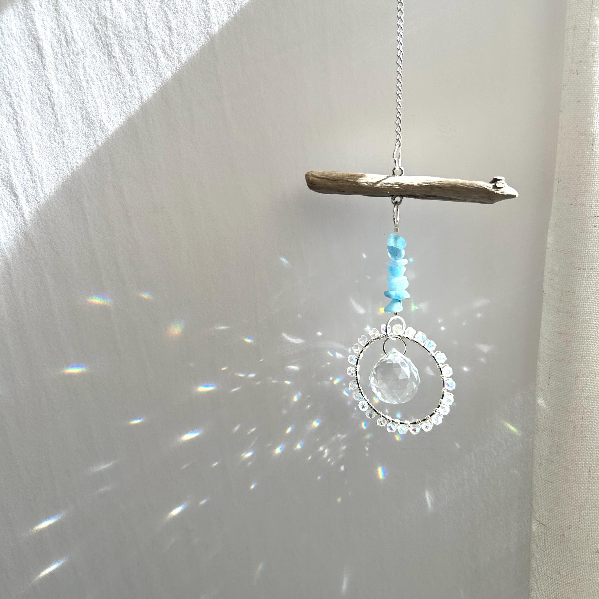 Bring a touch of whimsy and positive energy into your home with this captivating aquamarine, driftwood, and crystal prism suncatcher! Driftwood collected from the shores of the Long Island Sound is attached to a string of aquamarine and a sparkling-bead wrapped 2-in hoop. A 20mm (.79-inch) drop cut prism crystal adds a beautiful sparkle to this suncatcher. The silver plated chain (between 10-in and 12-in) and mini s-hook make it easy to hang this (approximately) 16-inch suncatcher wherever you'd like! The prism will show off its full potential in a south facing window, or any window that gets direct sunlight.