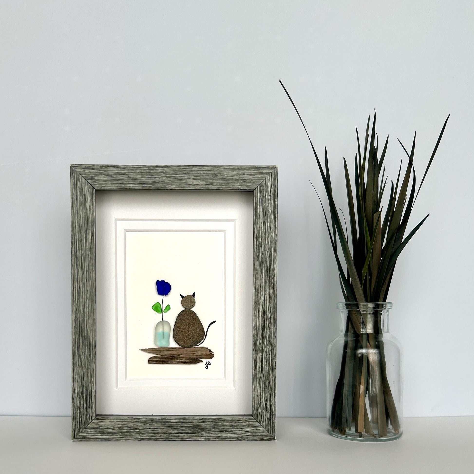 This charming 5x7 inch artwork features a cat sitting beside a vase. The cat is crafted from smooth beach pebbles, while the vase is created by layering watercolor beneath sea glass. Natural elements are hand-collected from the shores of the Long Island Sound and New England coast and carefully arranged in a shadowbox frame.