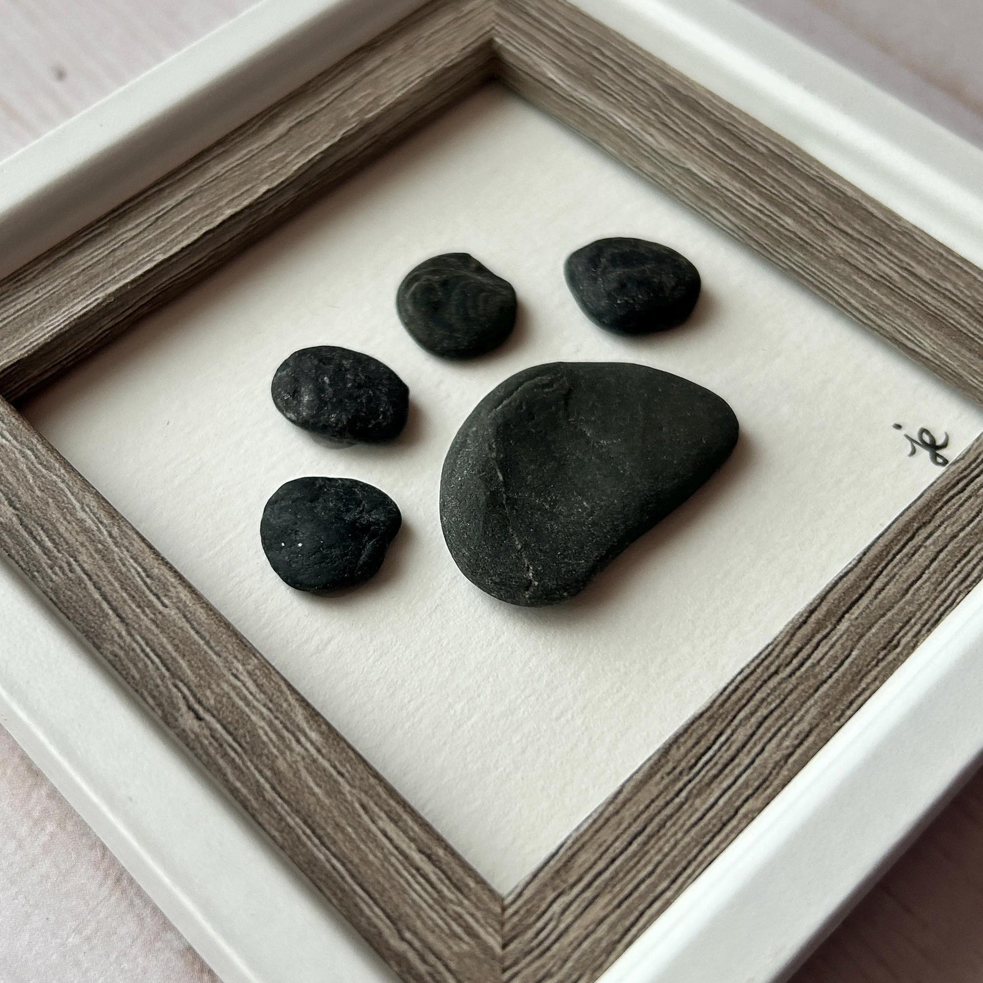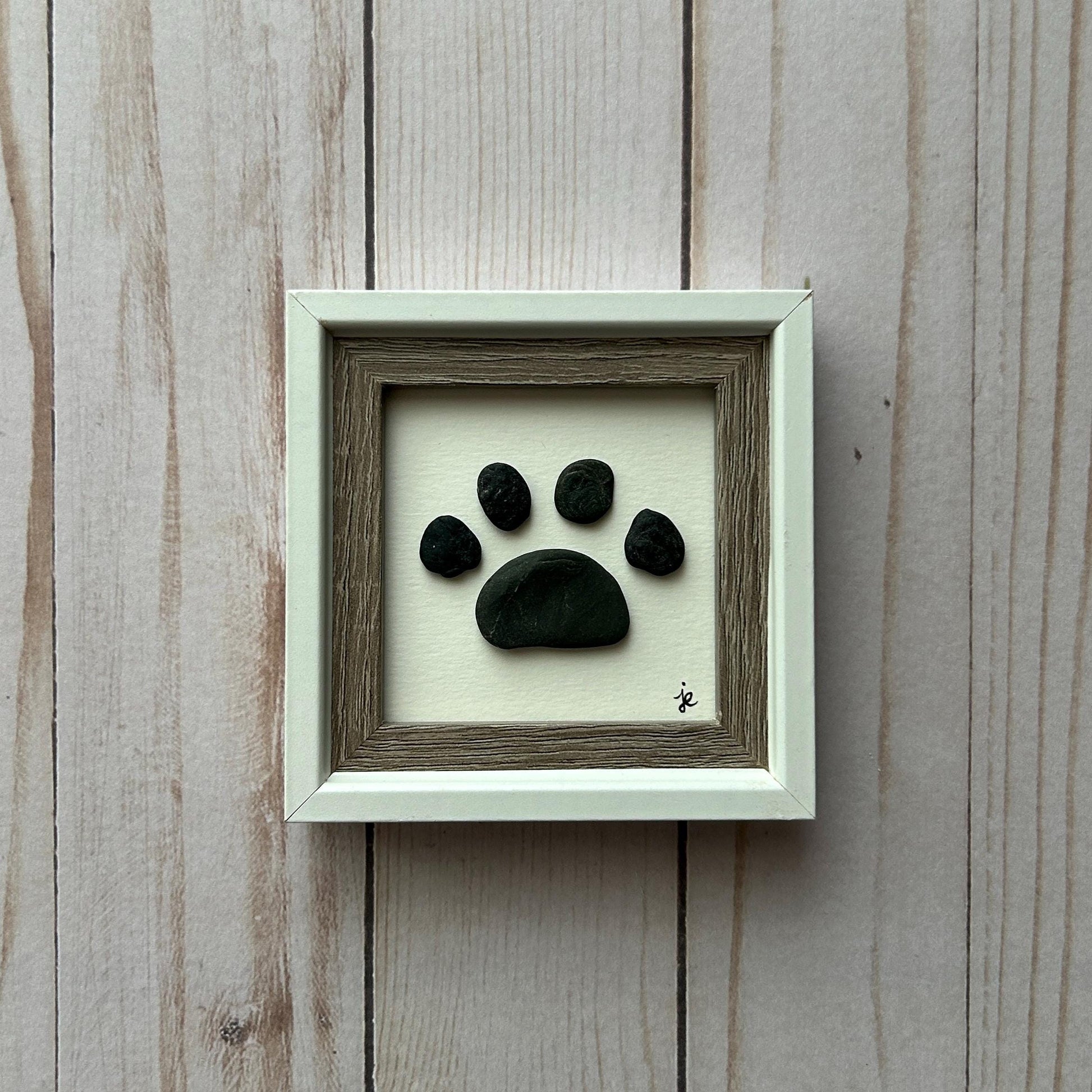This 3x3-inch mini artwork showcases a pawprint made of beach pebbles. Pebbles are hand-collected from the Long Island Sound and New England coast. Glass is not included.