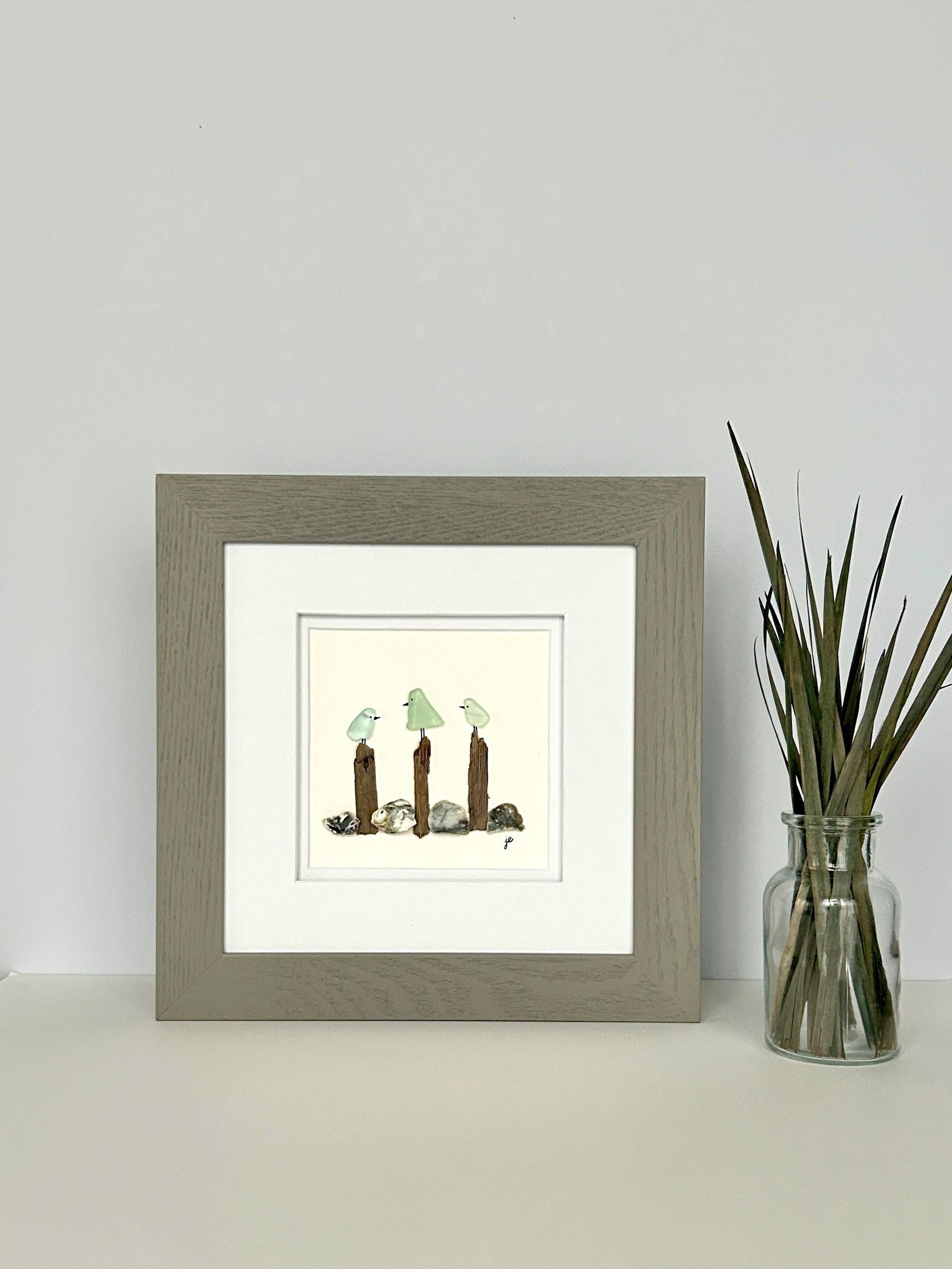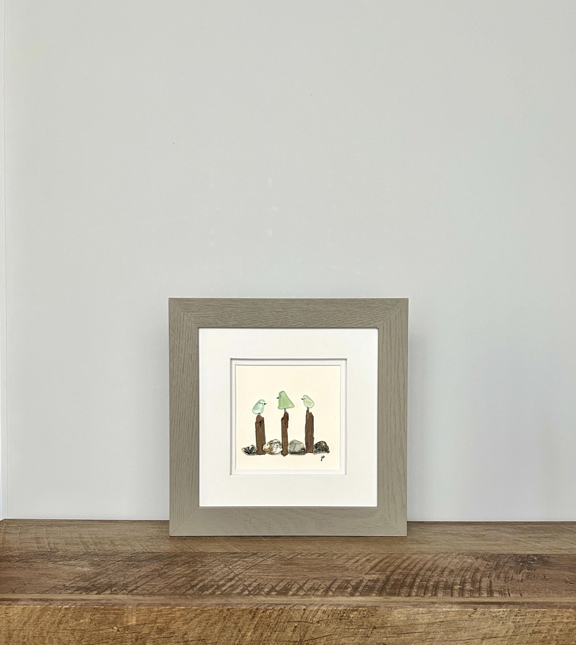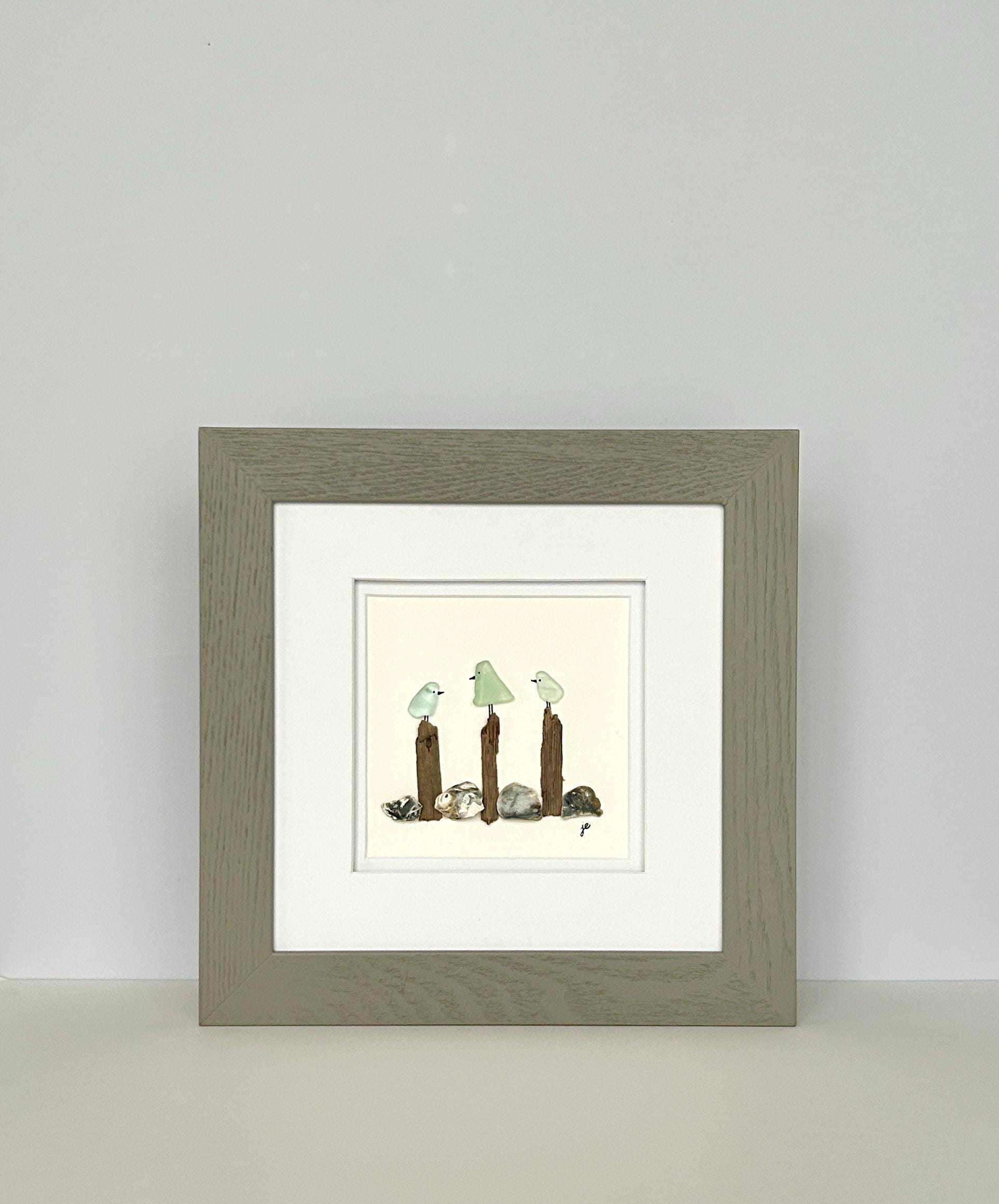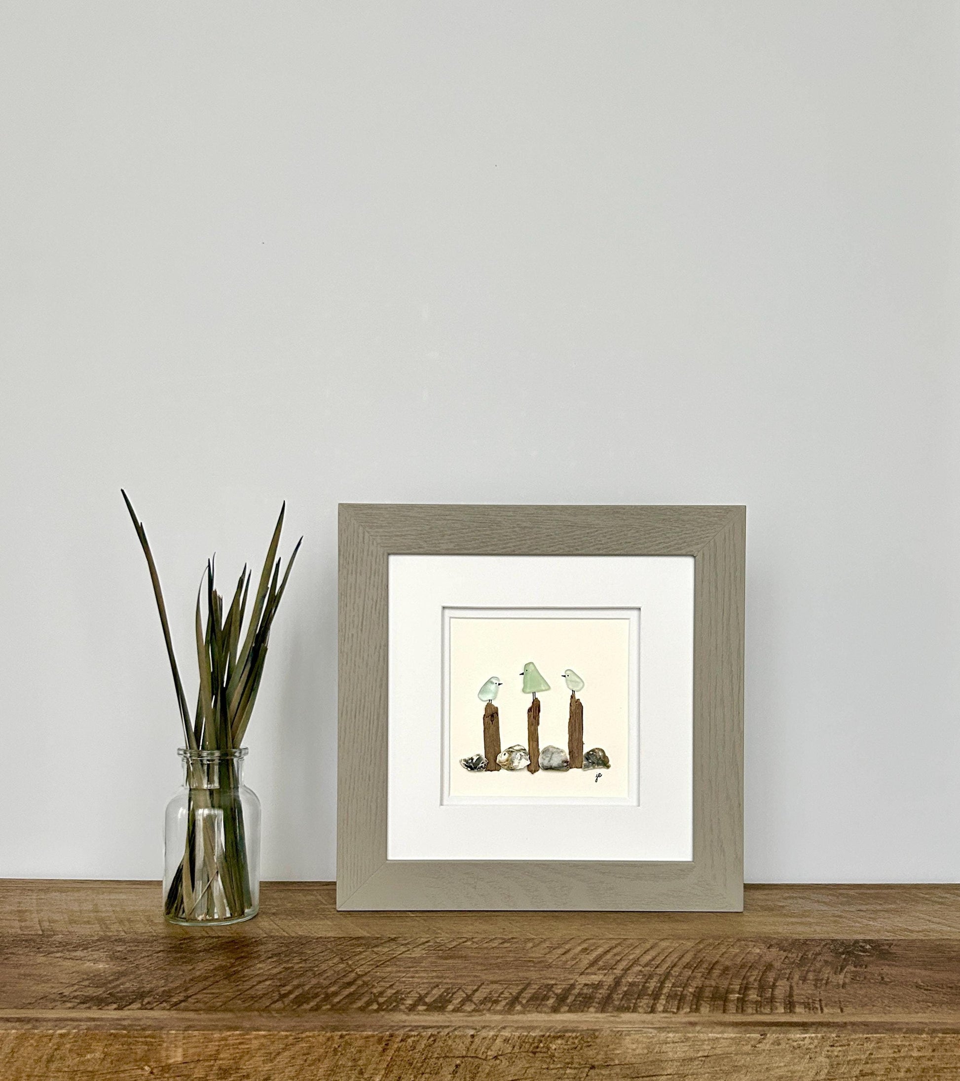 Add a bit of coastal charm to any space with this delightful scene of birds perched on driftwood posts. Sea glass, shells and driftwood are hand-picked from the shores of Connecticut and New England. Artwork is showcased in an 8x8-inch shadowbox frame, including glass and mat.
