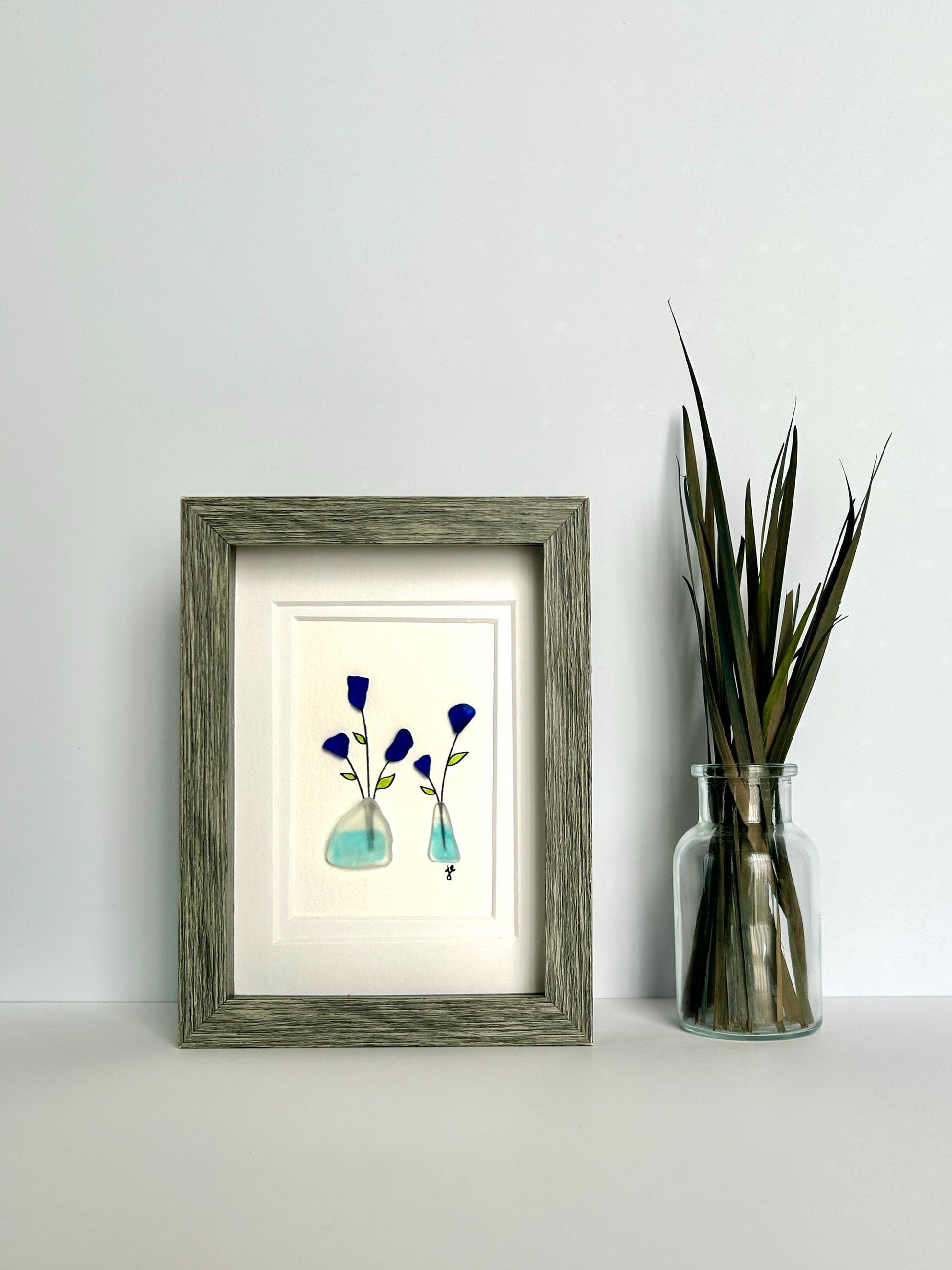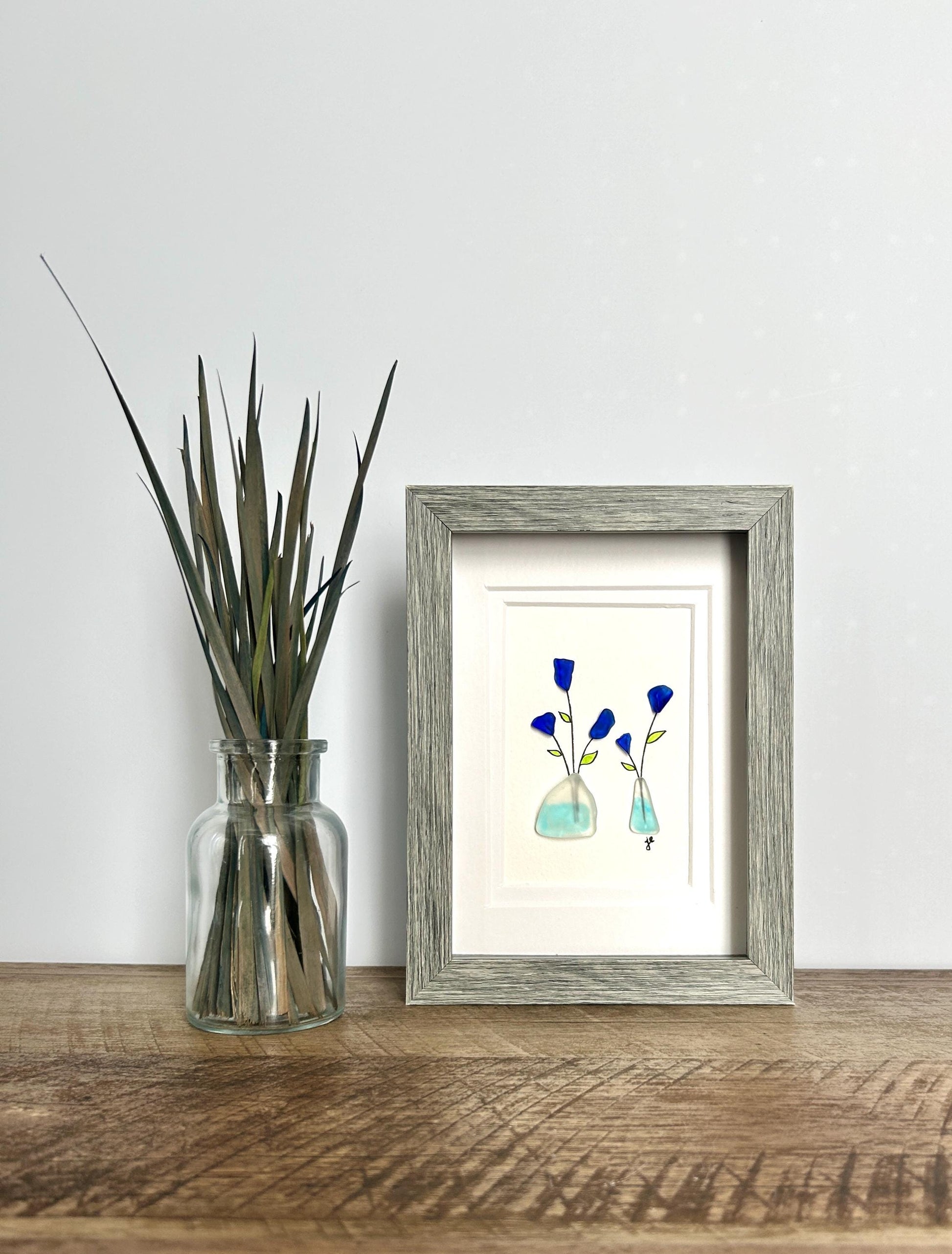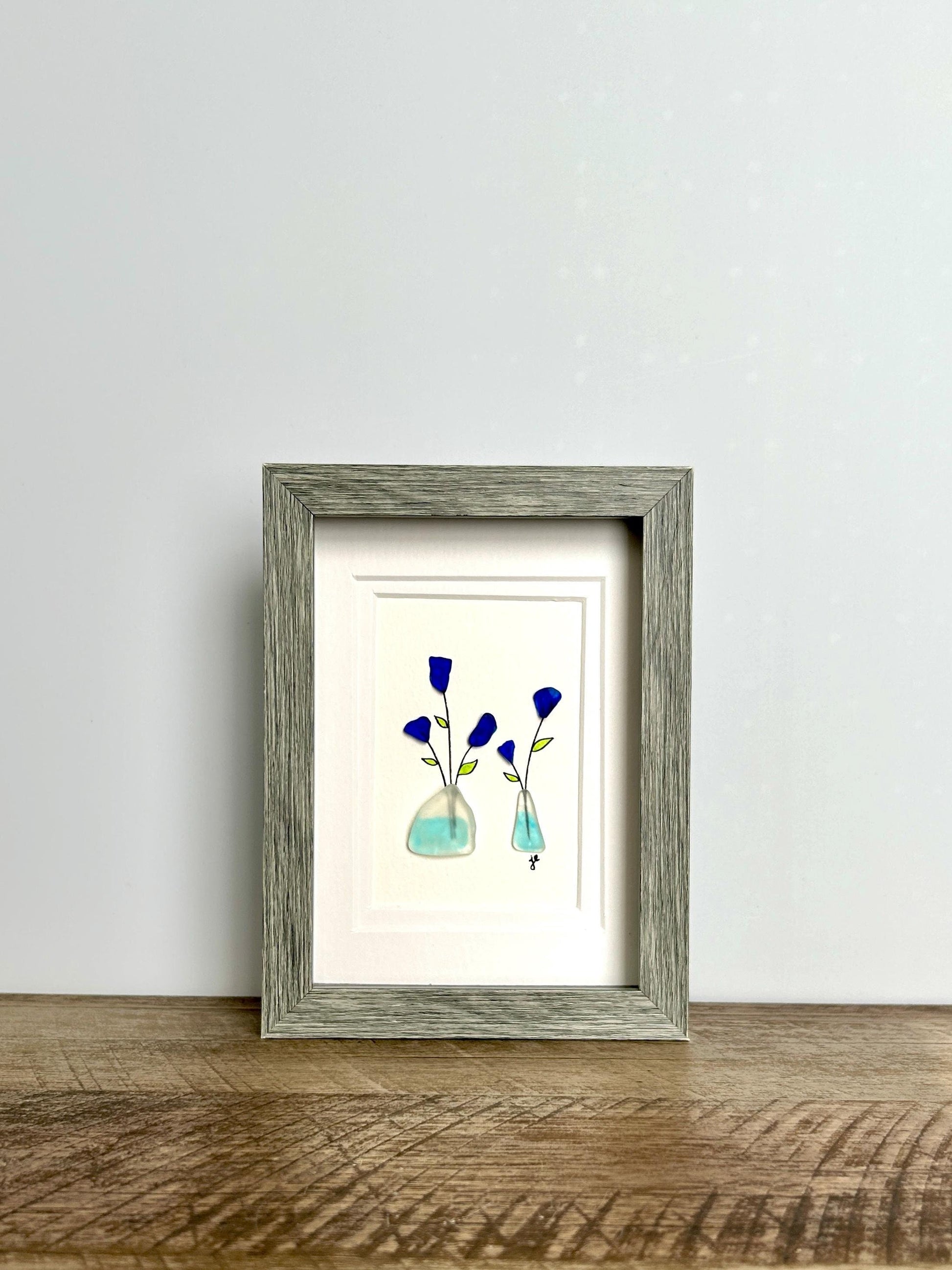 This 5x7-inch shadowbox artwork showcases vibrant blue flowers arranged in unique vases. The flowers and vases are crafted from sea glass, hand-collected from the Long Island Sound and New England coast. Vases are creatively designed by layering watercolor beneath the sea glass, adding depth and texture to the artwork.