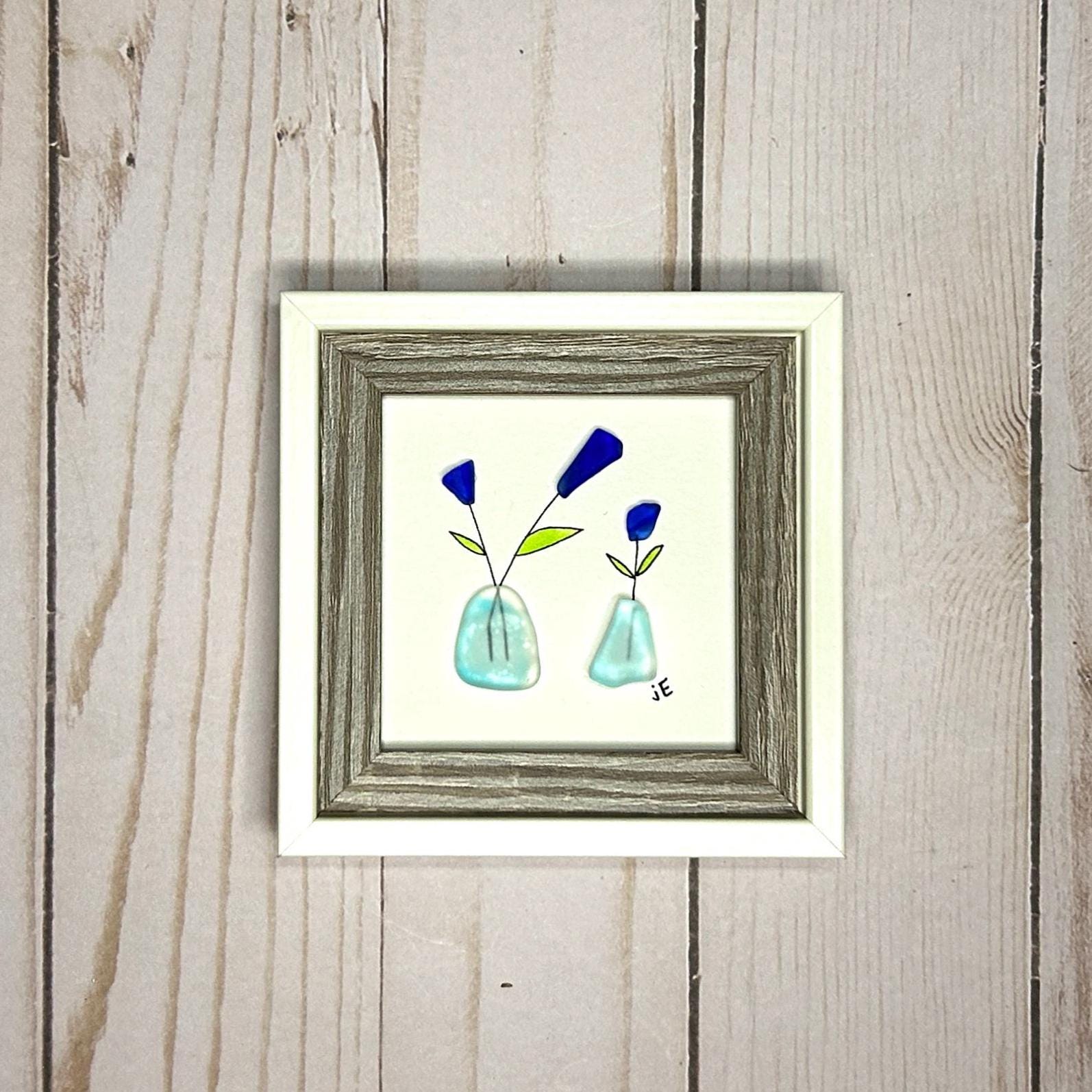 Blue Sea Glass Flowers in Vases - Framed Mini Artwork - 3x3