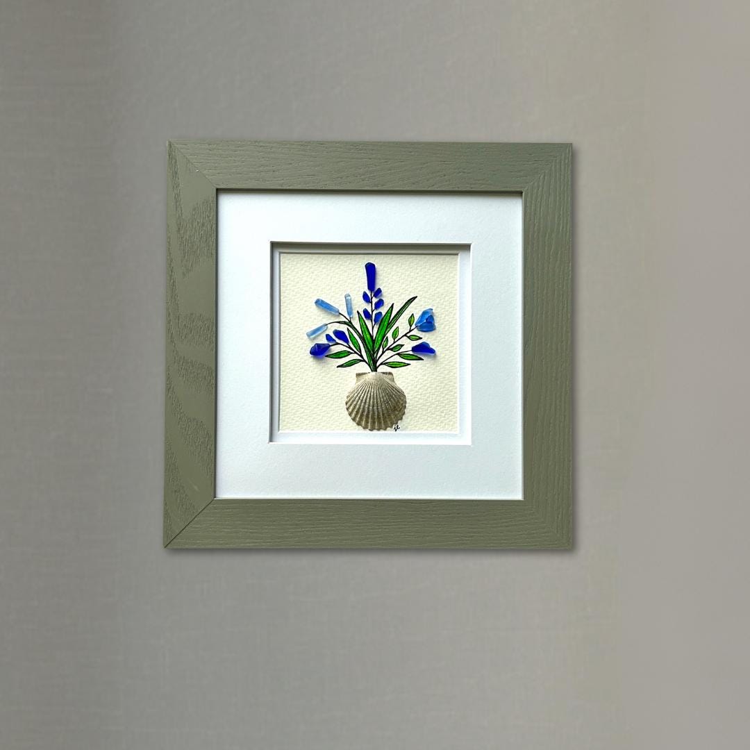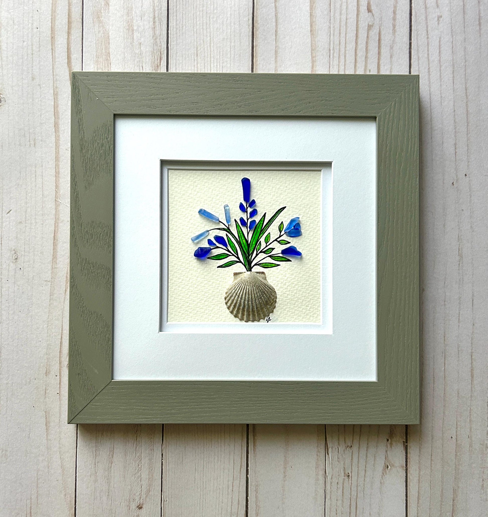 This original piece features a beautiful bouquet of blue sea glass flowers and a shell base blended with line and wash watercolor to create a dynamic, enchanting masterpiece. Sea glass and shell are hand-picked from the shores of the Long Island Sound in New England. Artwork is showcased in an 8-in x 8-in inch frame, including glass and mat.