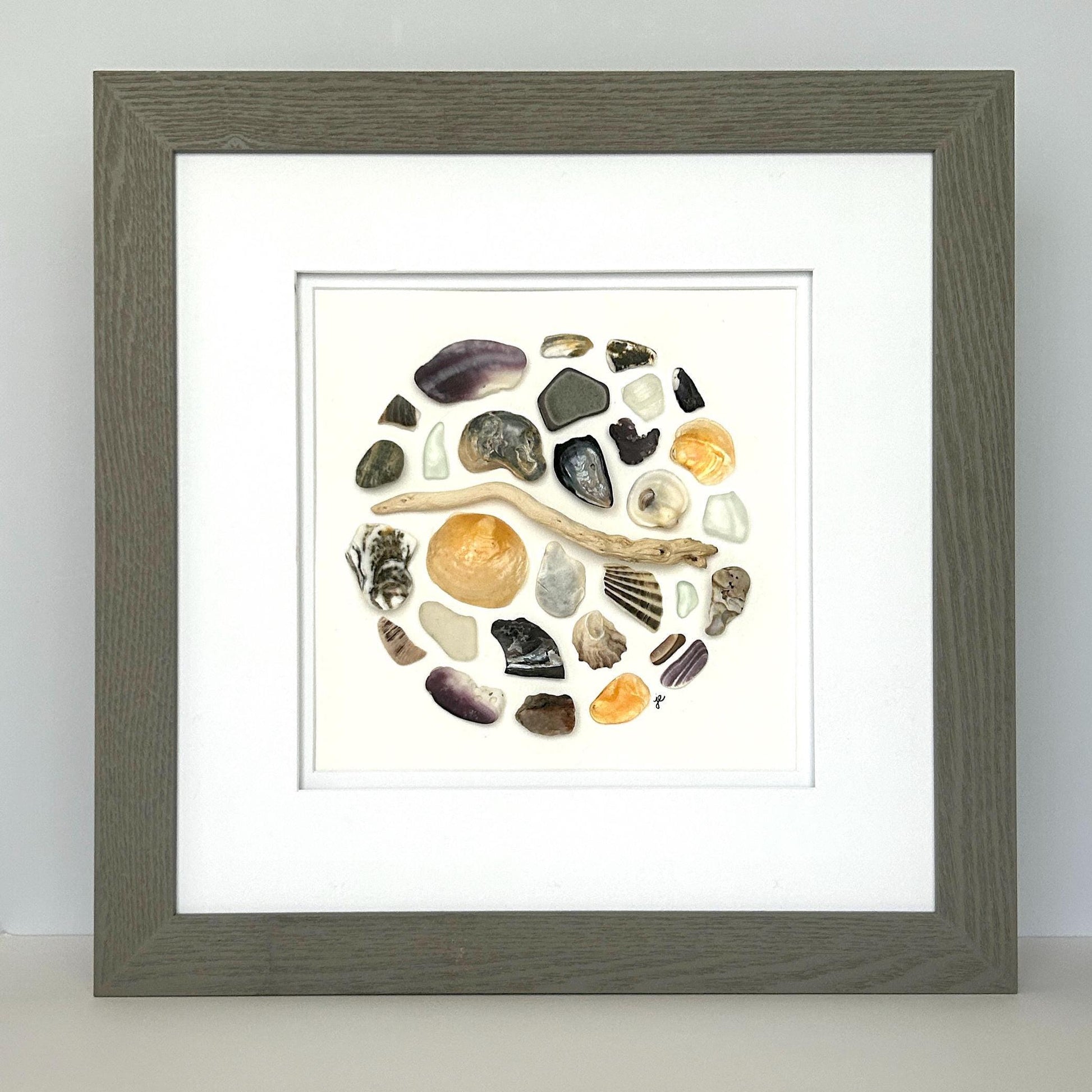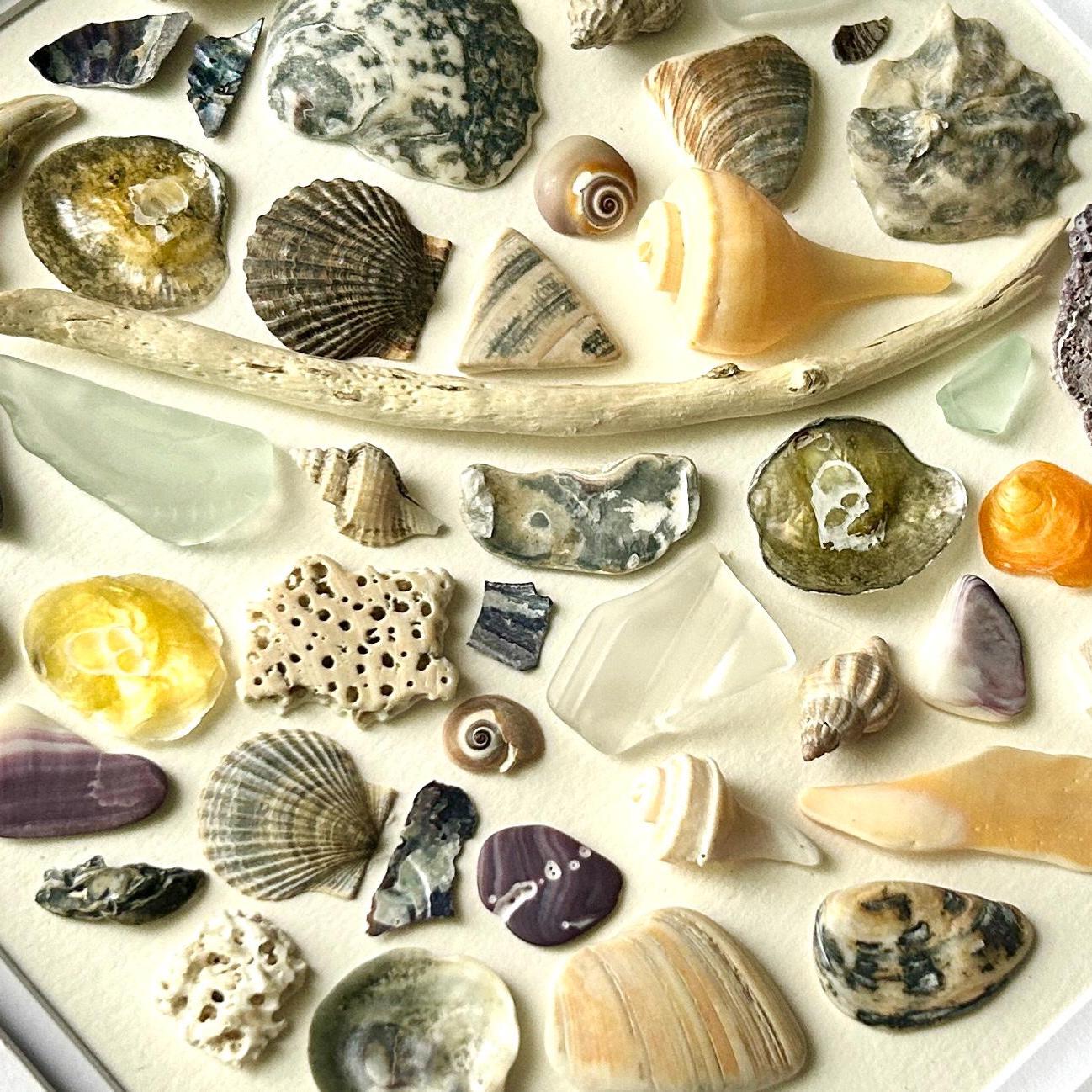 This stunning framed mosaic captures the essence of the coast in a captivating circular design. Crafted from a curated collection of natural treasures found along the Connecticut shoreline, including sea glass, shells, driftwood, and pebbles, this unique piece is a testament to the beauty and diversity of the ocean.