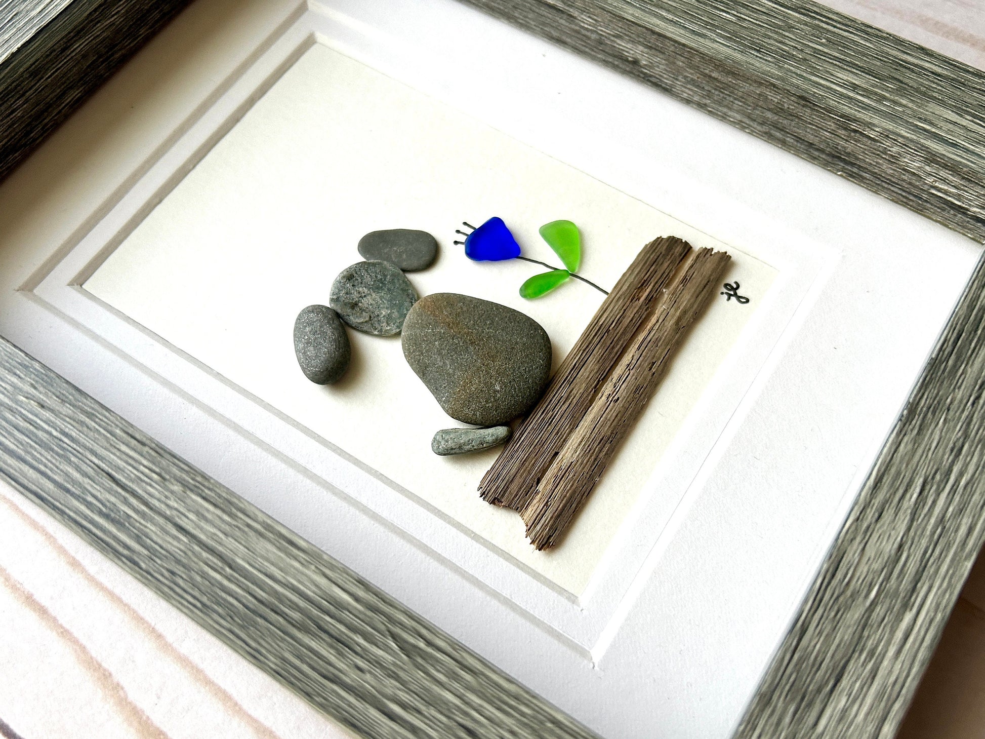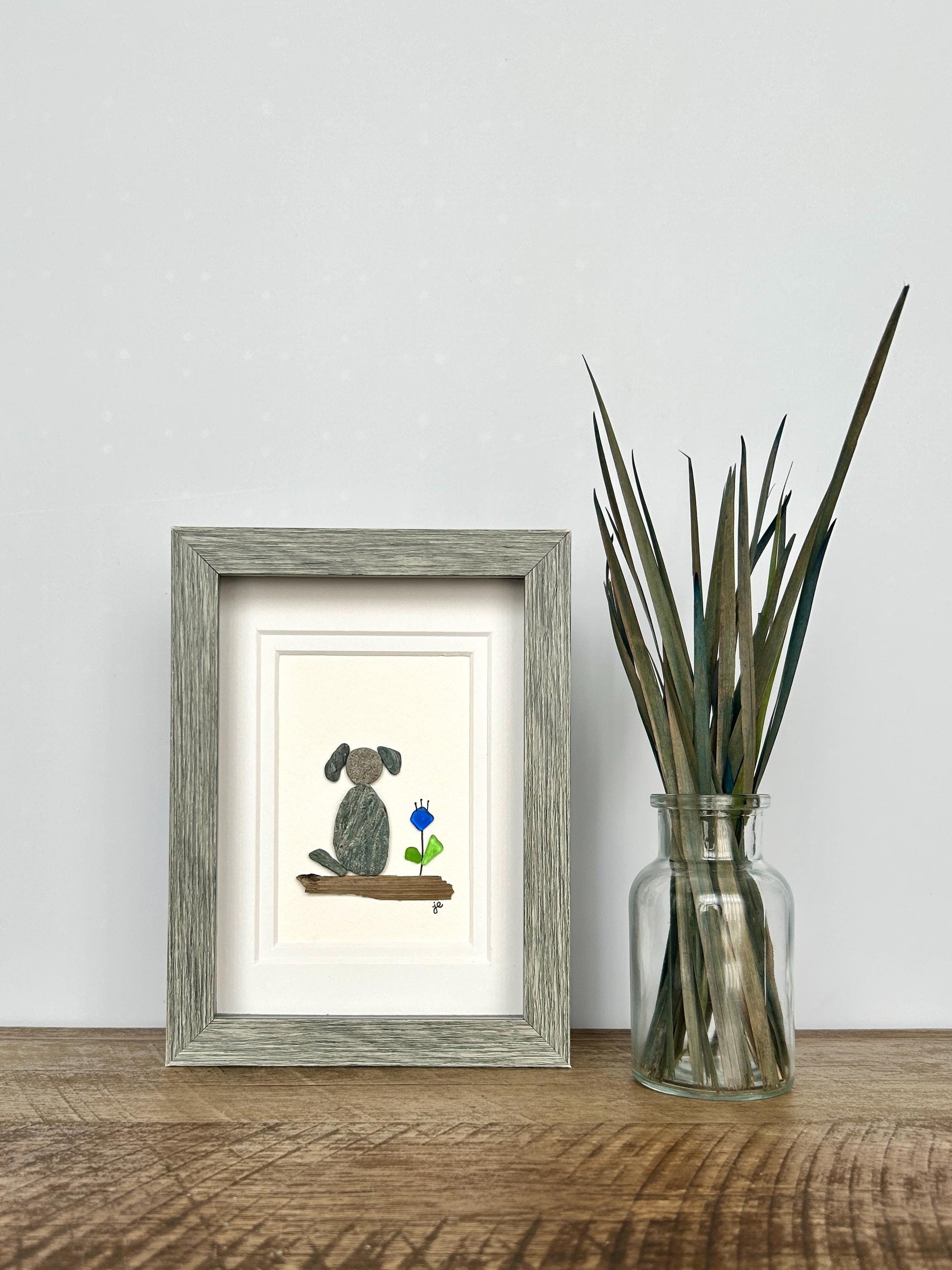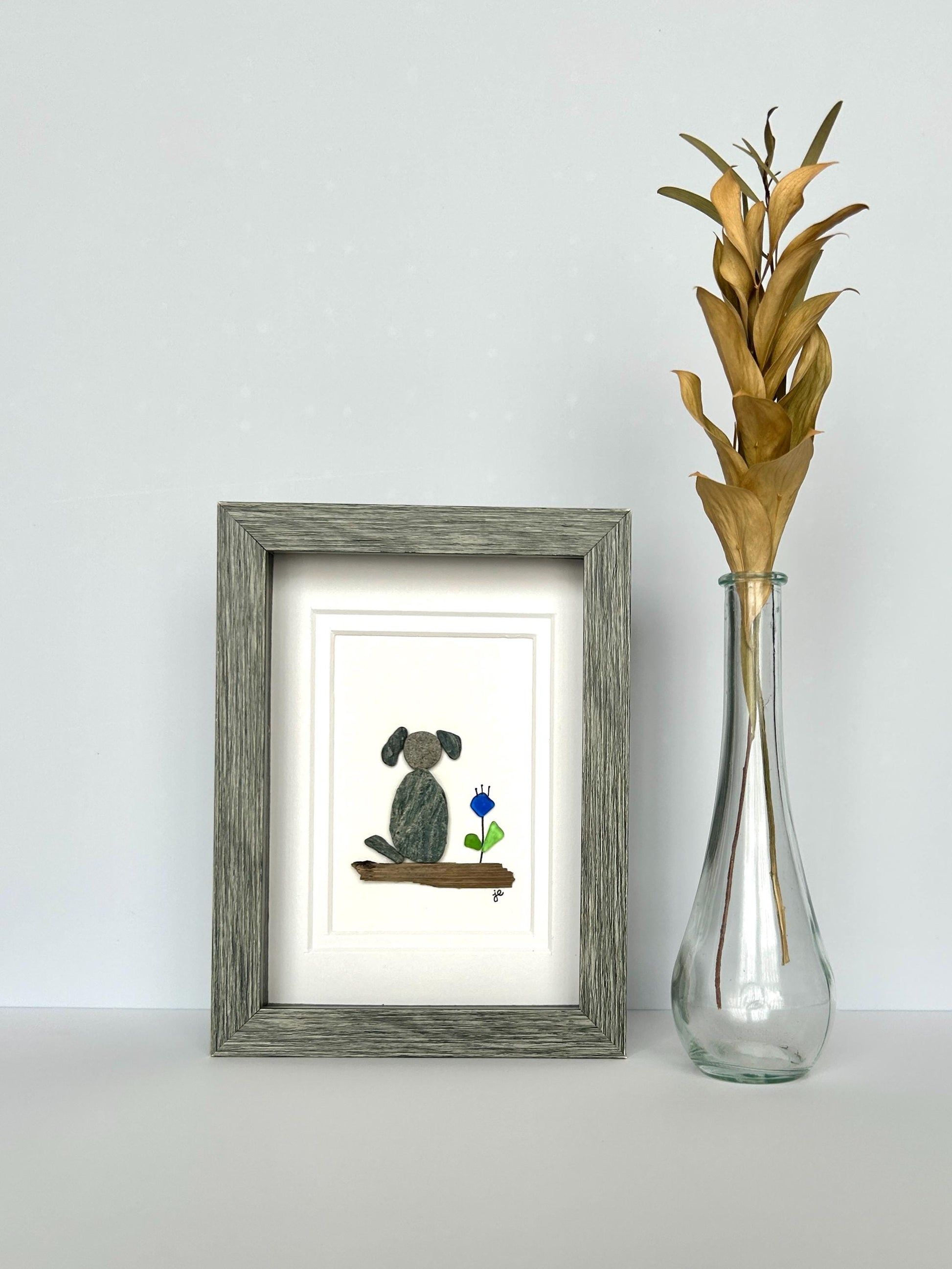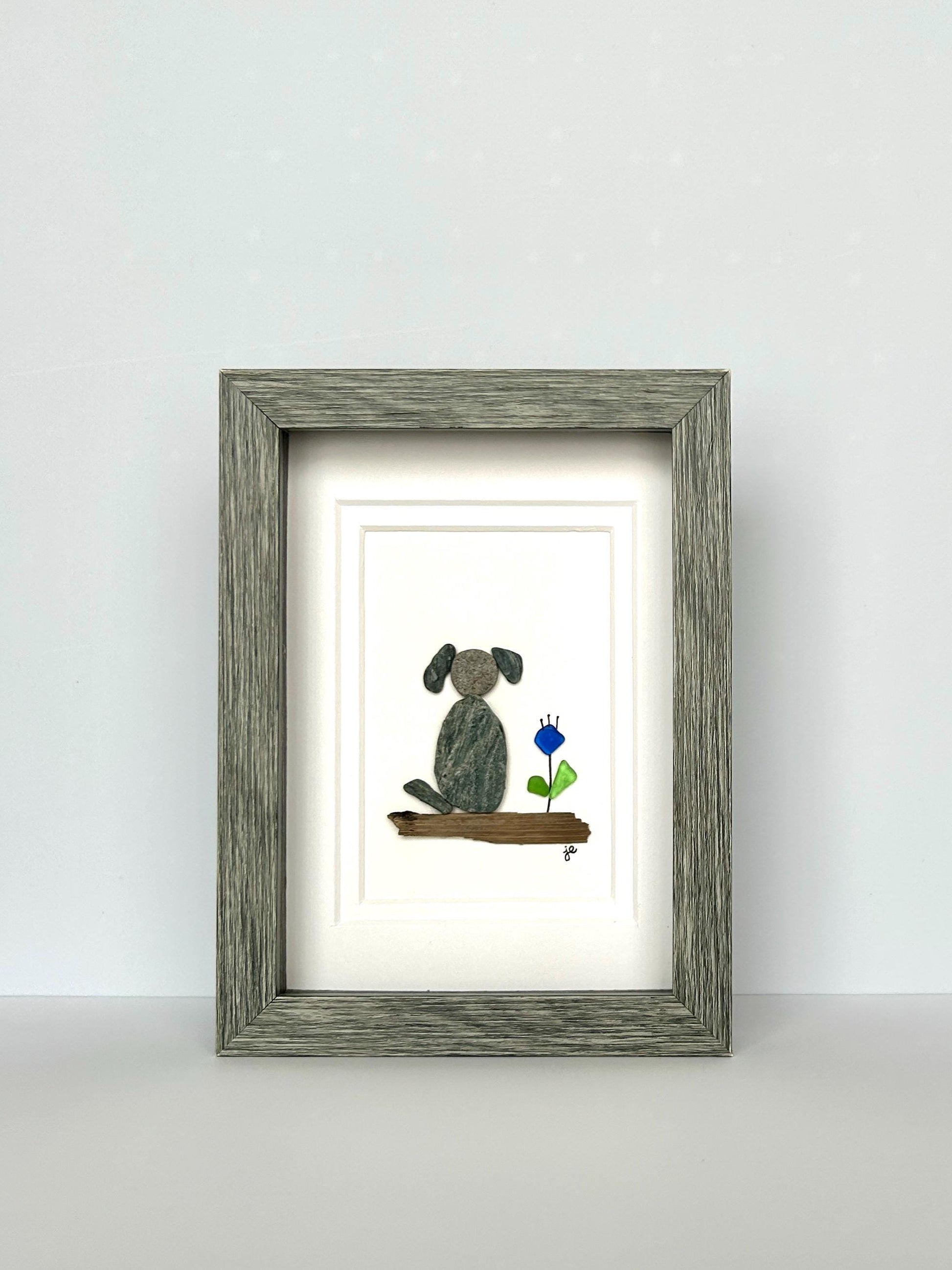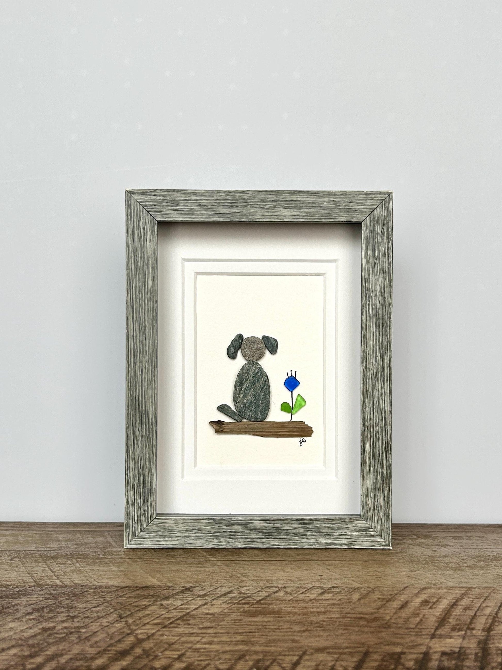 This charming 5x7-inch artwork features a dog and flower perched on driftwood. The dog is crafted from smooth beach pebbles, while sea glass and pen create a vibrant blue flower. Natural elements are hand-collected from the shores of the Long Island Sound and New England coast and carefully arranged in a shadowbox frame.