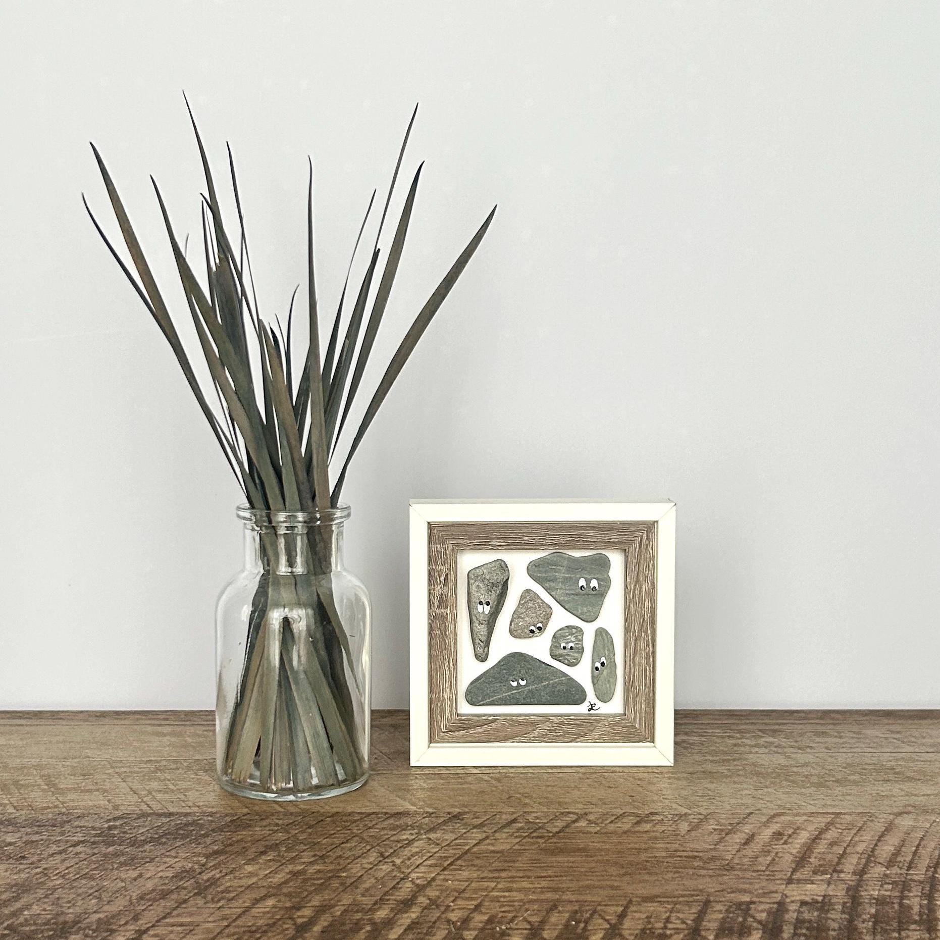 Beach pebbles with naturally created mouths are hand-picked from the shores of Connecticut and New England and transformed into unique personalities complete with hand-drawn eyes. Presented in a 3x3-inch frame. Glass is not included.
