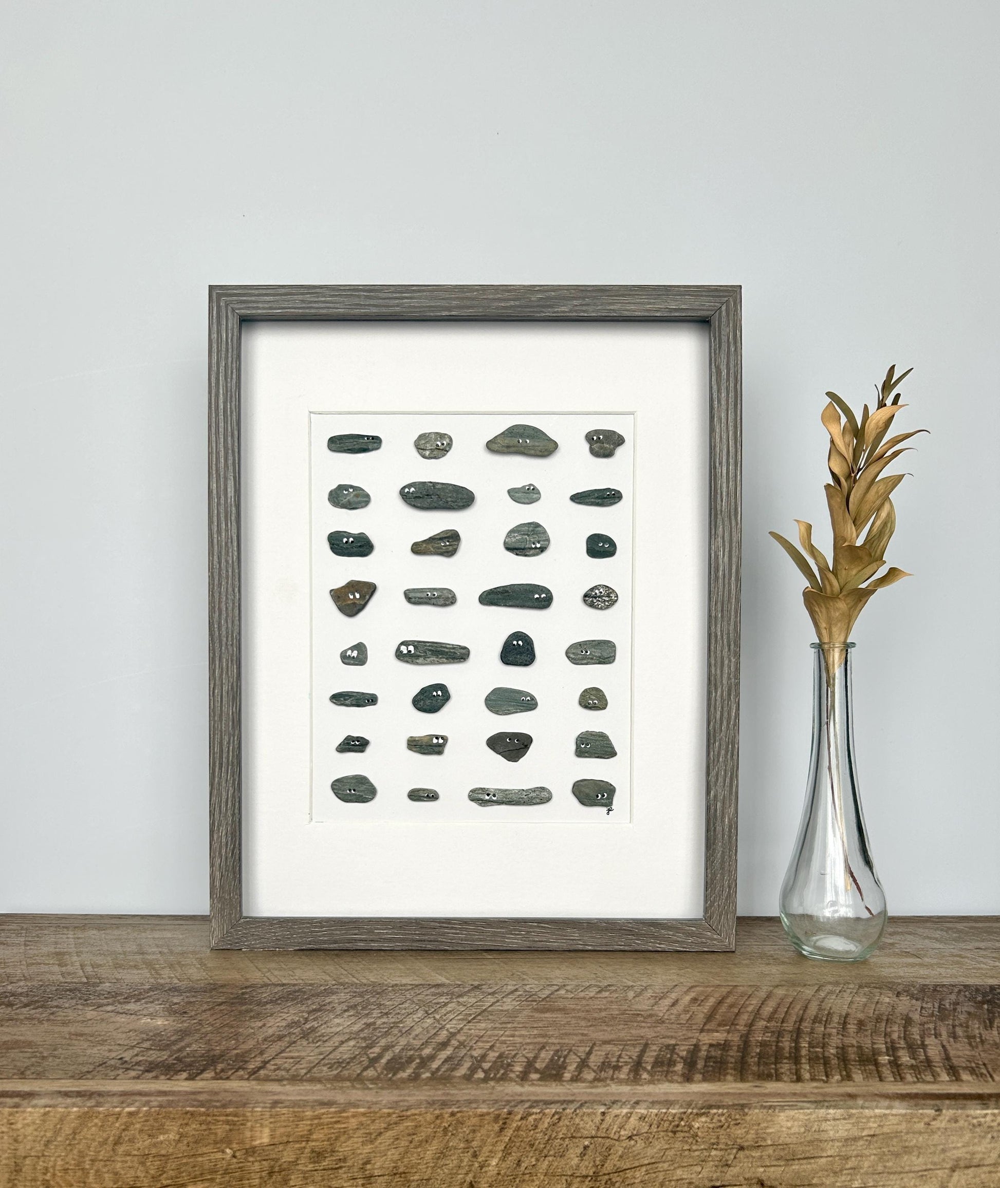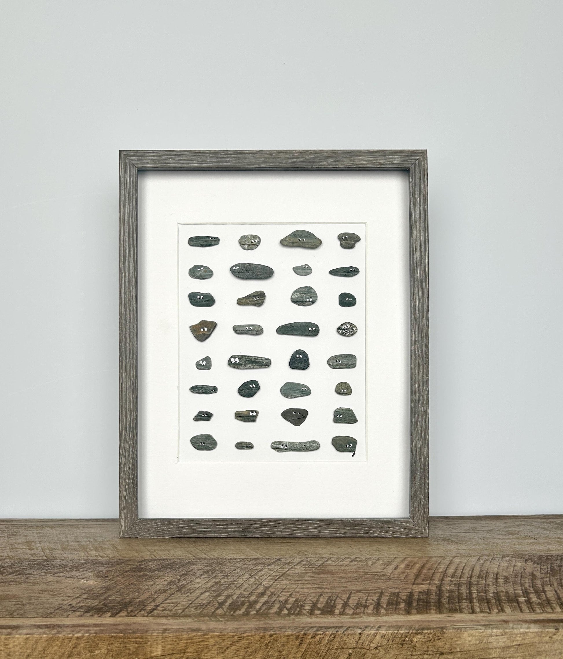 Rocks with naturally created mouths are hand-picked from the shores of Connecticut and New England and transformed into unique personas complete with hand-drawn eyes. Presented in an 11x14-inch shadowbox frame.