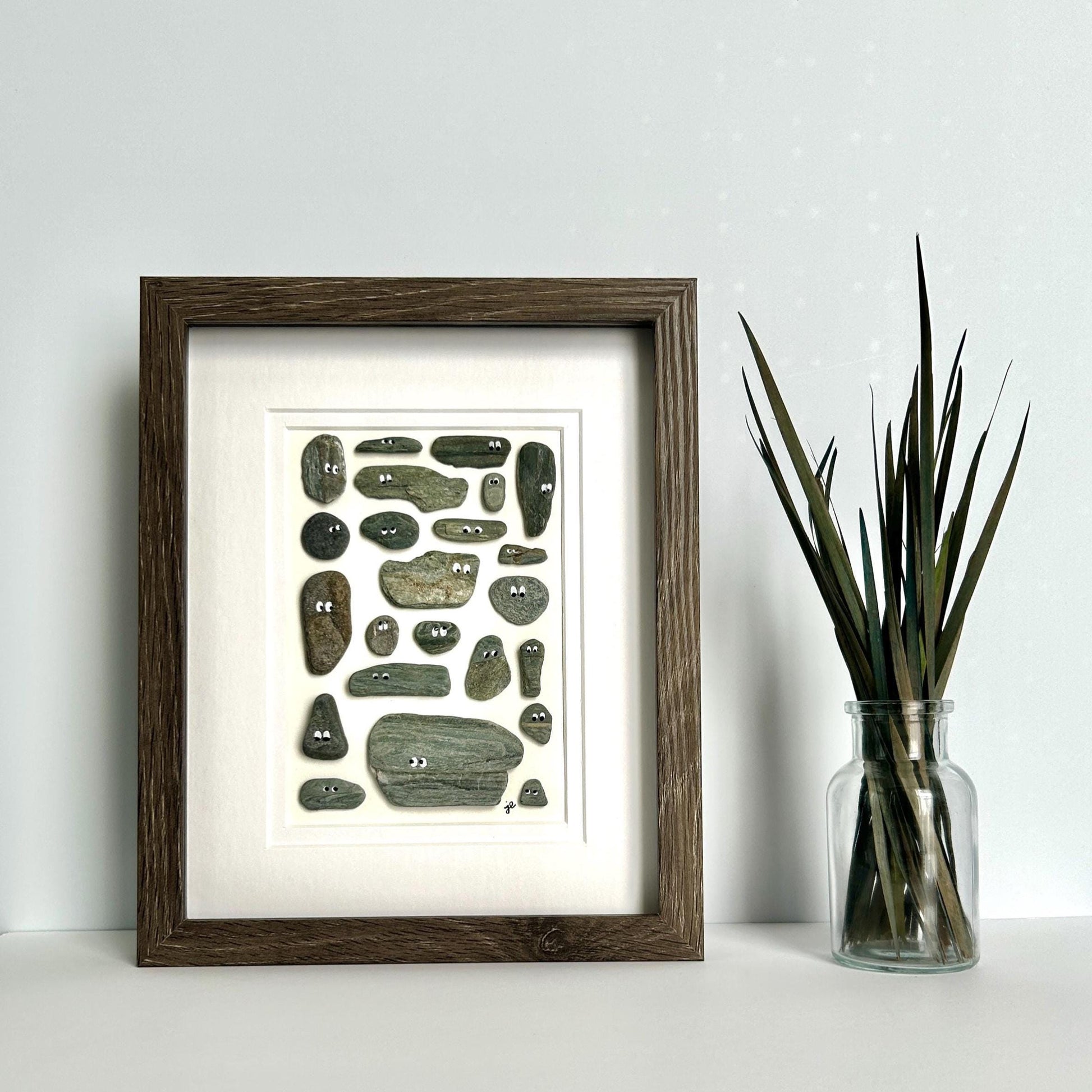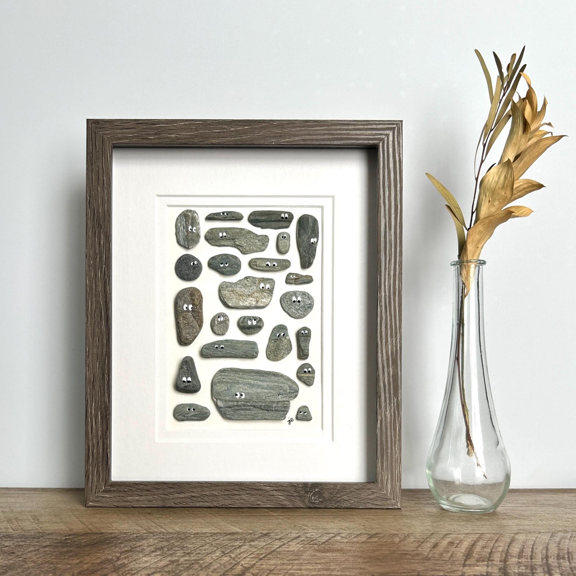 Rocks with naturally created mouths are hand-picked from the shores of Connecticut and New England and transformed into unique personas complete with hand-drawn eyes. Presented in an 8-in x10-in shadowbox frame.