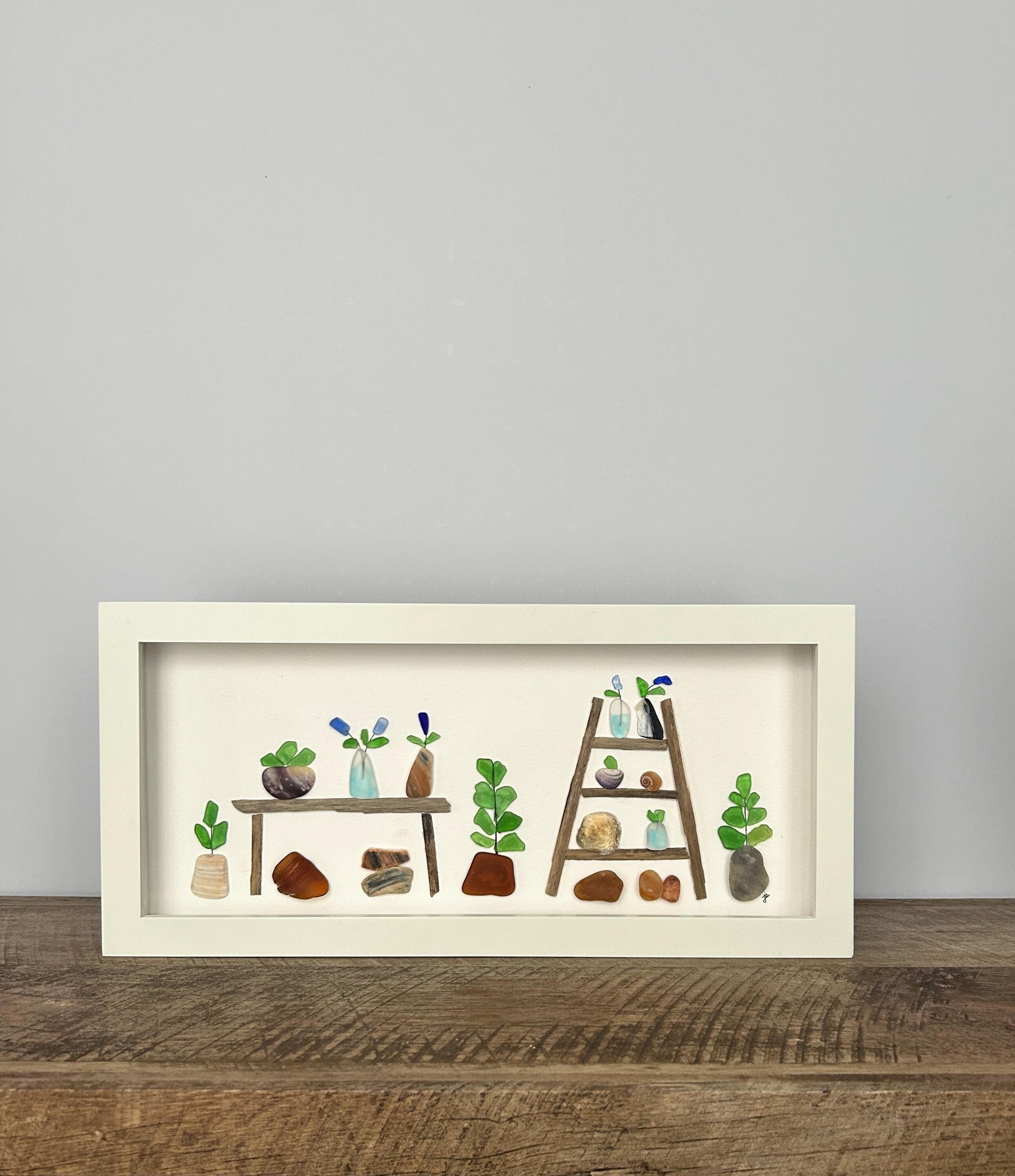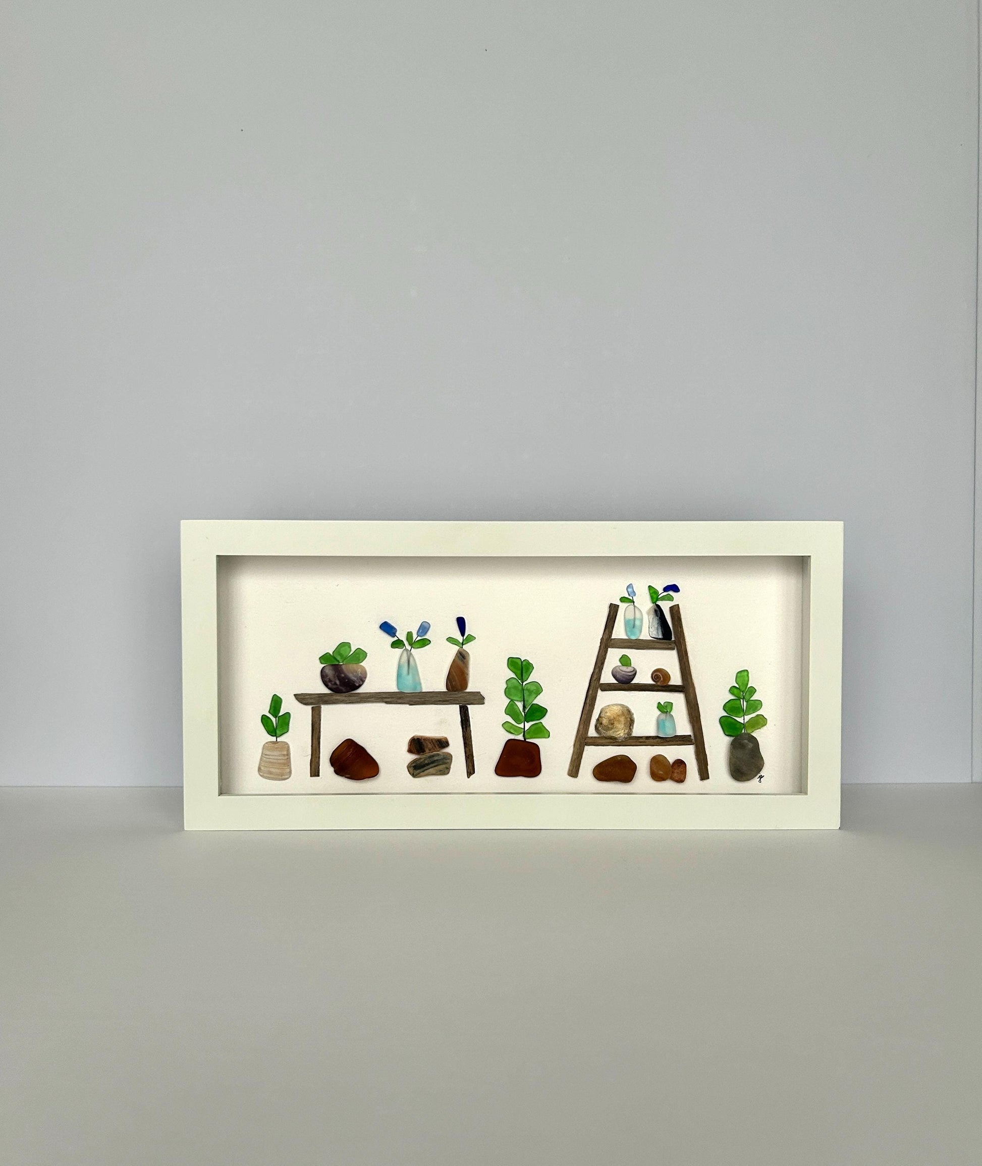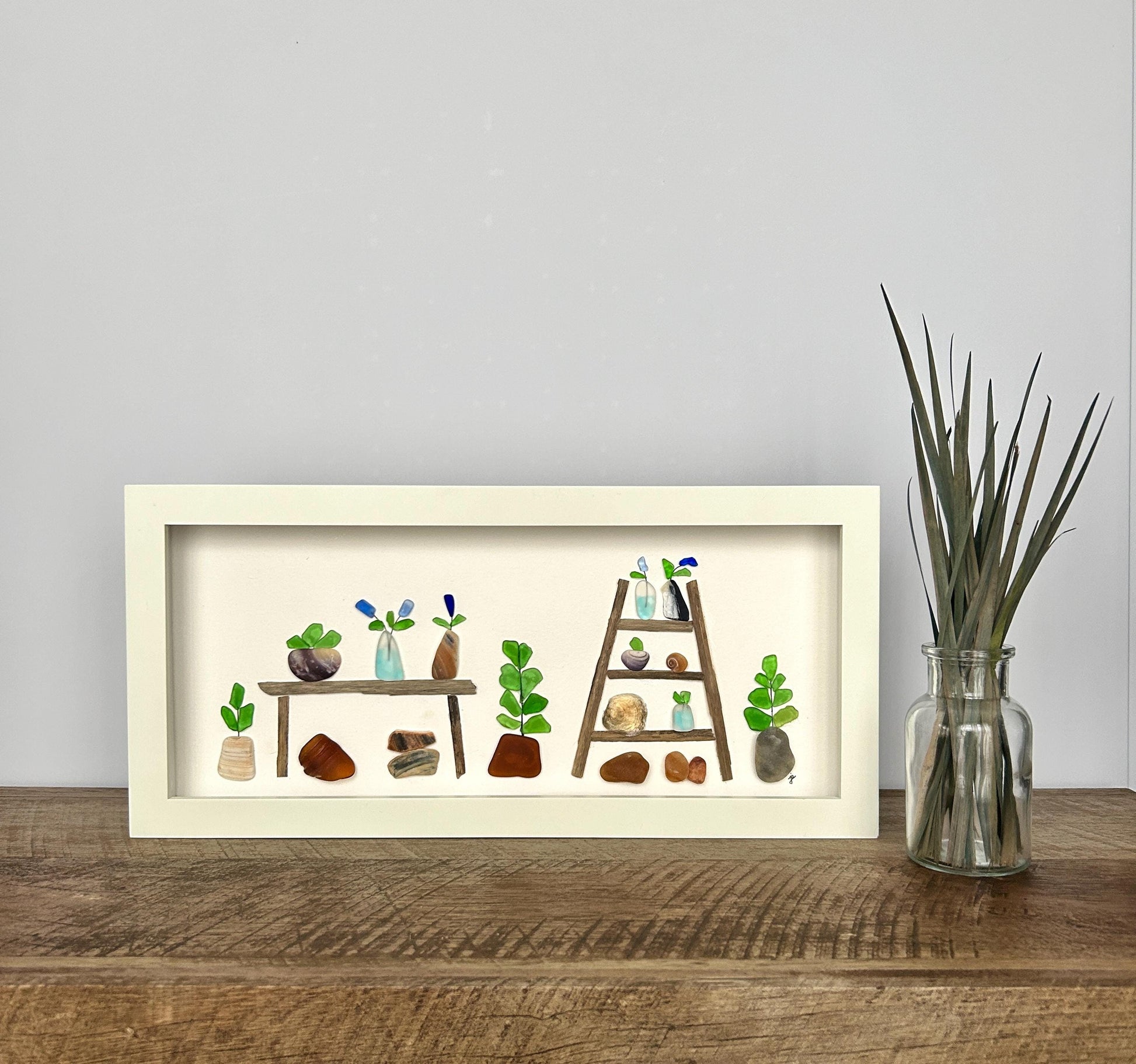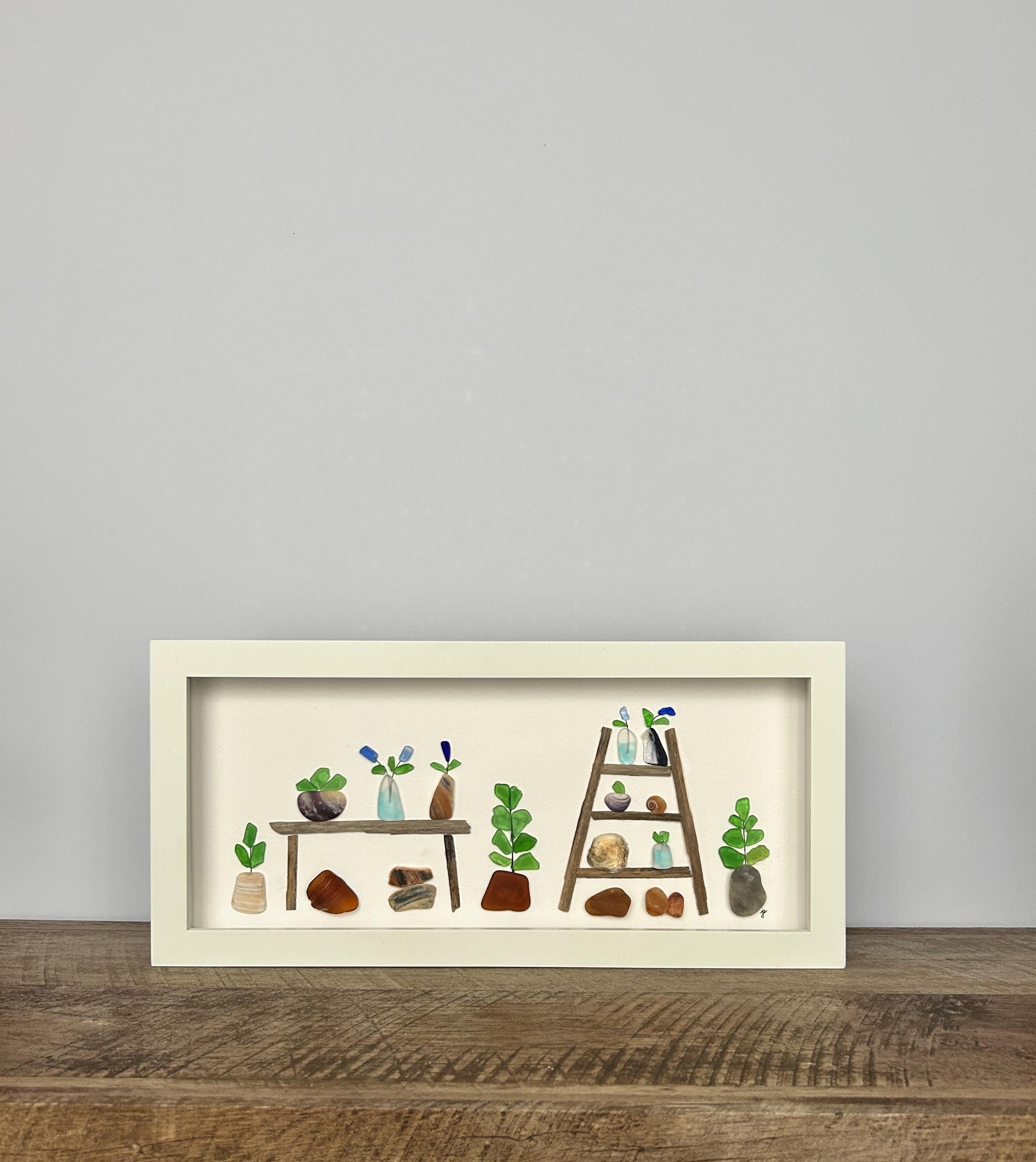 This 6x14-inch shadowbox artwork captures the beauty of a plant filled room, with vibrant flowers and plants blooming in unique potted arrangements. A rustic bookcase holds some pots, while others sit on a driftwood table, adding depth and dimension to the scene.