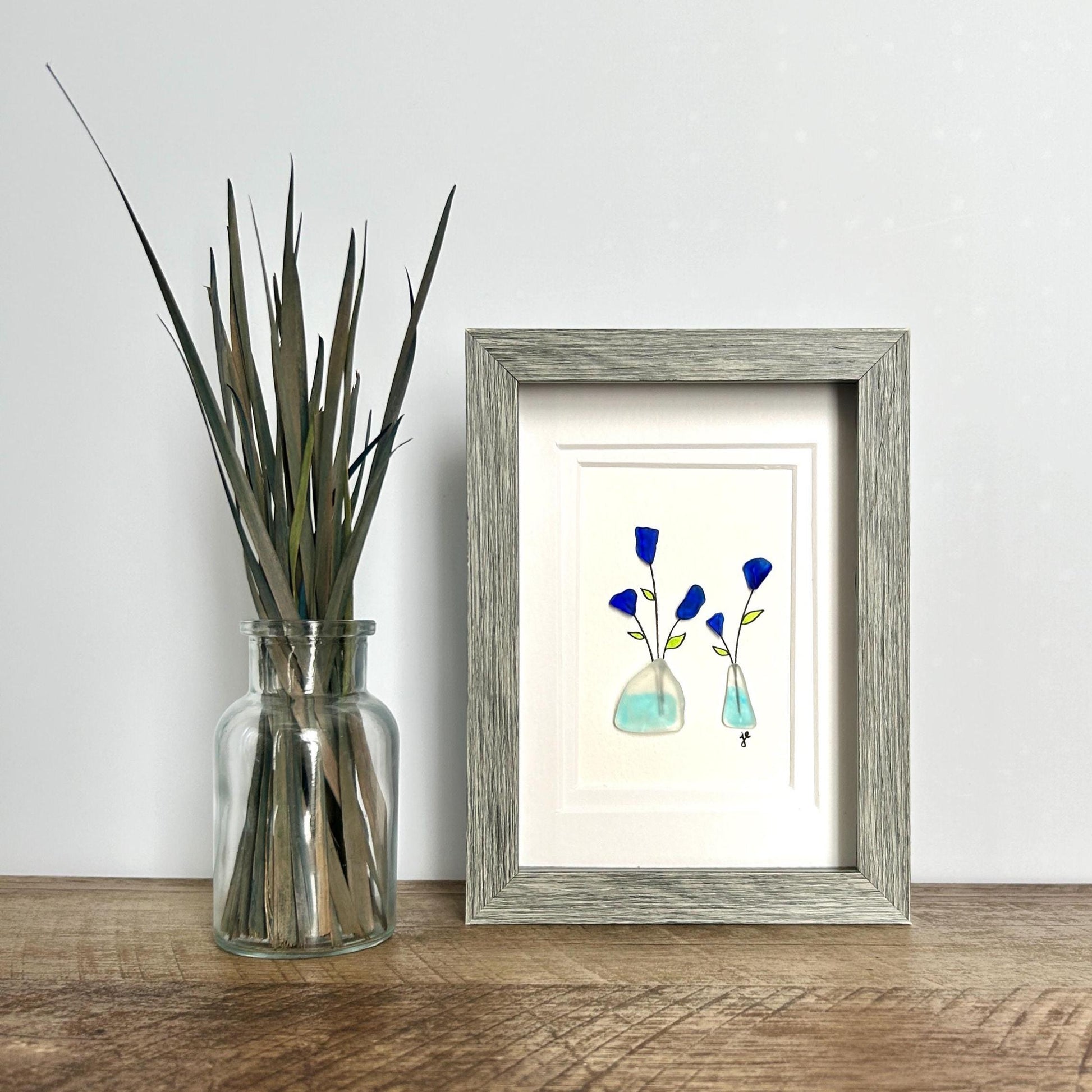 This 5x7-inch shadowbox artwork showcases vibrant blue flowers arranged in unique vases. The flowers and vases are crafted from sea glass, hand-collected from the Long Island Sound and New England coast. Vases are creatively designed by layering watercolor beneath the sea glass, adding depth and texture to the artwork.