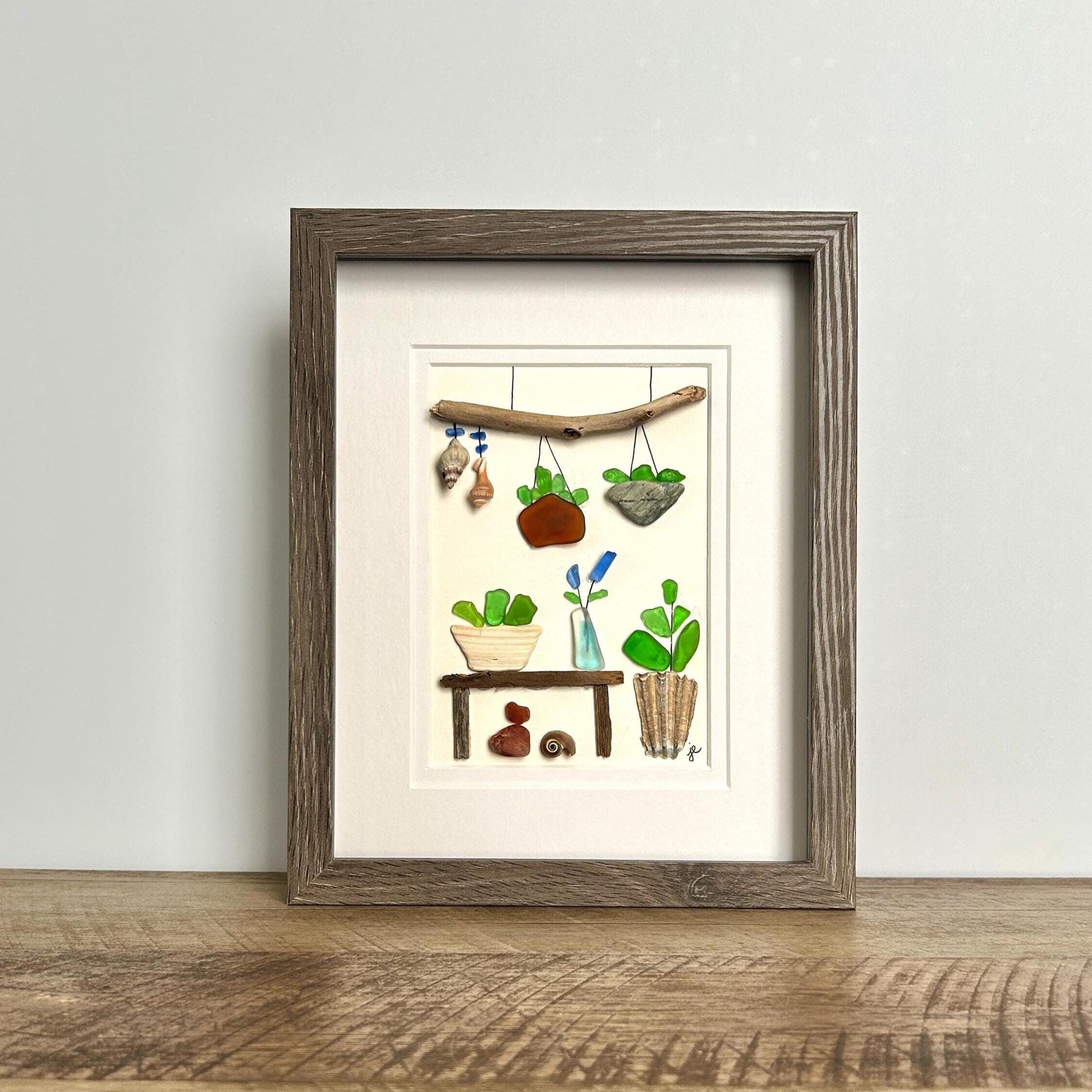This 8x10-inch shadowbox artwork captures the essence of a plant room, with vibrant flowers and plants blooming in unique potted arrangements. Sea glass, driftwood, pebbles, shells, and other natural materials used in this piece are hand-collected from the Long Island Sound and New England coast, making each artwork truly unique. The intricate details and playful design bring the coastal scene to life, creating a sense of tranquility and wonder.